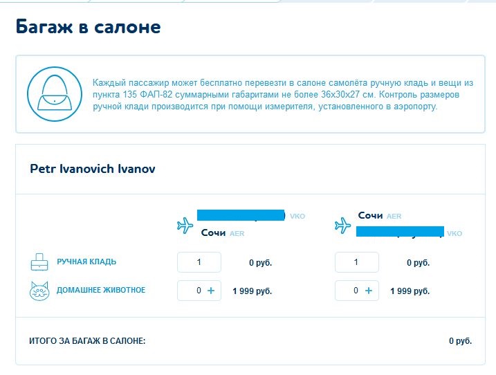 Размеры ручной клади не должны превышать 36x30x27 см. Вес ручной клади не ограничен, но она должна помещаться под сиденье впереди стоящего кресла.